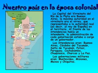 La sociedad colonial en el Virreinato del Río de la Plata estaba dividida en grupos sociales según el origen y el color de piel. La capital era Buenos Aires y estaba gobernada por un virrey que representaba al rey de España. La economía se basaba principalmente en el comercio y el contrabando debido al sistema de monopolio español. Los medios de transporte eran lentos, como carretas y mulas, y la comunicación se realizaba a través de correspondencia y mensajeros a caballo.