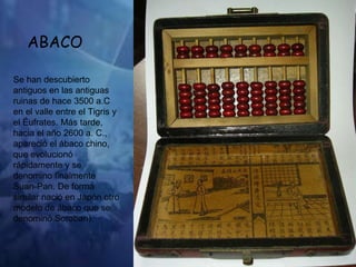 Se describen los orígenes del ábaco y los primeros intentos de crear máquinas de calcular automáticas, como la máquina de Pascal y la calculadora universal de Leibniz. Posteriormente, se mencionan inventos como la máquina analítica de Babbage, la primera calculadora comercial de Steiger y las primeras computadoras como la ENIAC y la ABC. Finalmente, se explican las cinco generaciones de computadoras según los componentes electrónicos utilizados.