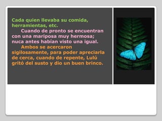 Tobi y Lulú realizan una expedición al bosque donde se encuentran con una mariposa, pero sufren un conflicto tras un susto y un descuido. A lo largo del día, comparten momentos de enojo y reconciliación, lo que les lleva a reflexionar sobre la importancia de la tolerancia hacia las diferencias entre las personas. Al final, aprenden que todos pueden sentir miedo y que es fundamental respetar y aceptar las diversidades.