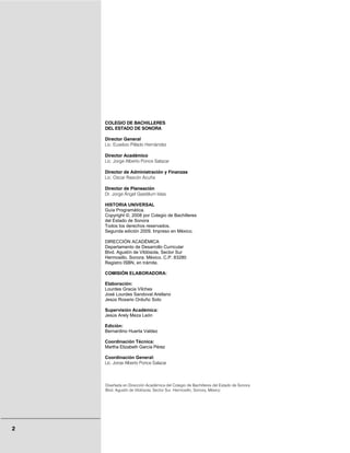 Este documento presenta una guía programática para la asignatura de Historia Universal impartida en el Colegio de Bachilleres del Estado de Sonora. La guía describe los objetivos de la asignatura, las cuatro unidades temáticas, los contenidos de cada unidad y sugerencias didácticas. La asignatura se enfoca en explicar el panorama del mundo actual contextualizando la crisis del capitalismo en el siglo XX, los procesos bélicos mundiales y el nuevo orden internacional de globalización. Las unidades cubren la crisis de los estados modernos, el mundo entre guerr