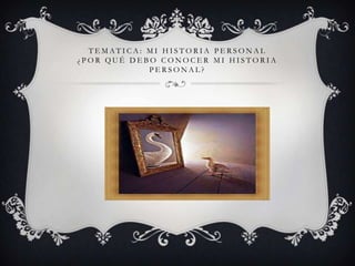 Este documento presenta una lección sobre la importancia de conocer la propia historia personal. Propone que los estudiantes creen líneas de tiempo, compartan recuerdos significativos en grupo y escriban breves historias personales usando fotografías para describir eventos clave en sus vidas. El objetivo es ayudar a los niños a reconocer que tienen una historia única y valorar cómo han cambiado a lo largo del tiempo.