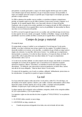 El documento describe la historia y reglas del voleibol. El voleibol fue inventado en 1895 en Estados Unidos por William G. Morgan como un juego de interior para equipos. Las reglas iniciales fueron revisadas en 1912 y 1922 para establecer el número de jugadores, rotación en el saque y puntos para ganar un set. El voleibol se ha modificado con el tiempo para hacerlo más dinámico, como la introducción del jugador líbero en 1998.