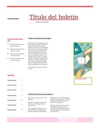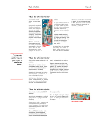 Este documento presenta un boletín informativo con varios artículos breves. El boletín incluye un título principal, puntos de interés destacados sobre varios temas y cuatro artículos cortos sobre temas como las ventajas de usar boletines para promocionar un negocio y sugerencias para elegir imágenes. El documento proporciona consejos sobre cómo crear contenido útil y atractivo para lectores potenciales.