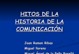 Este documento resume los principales hitos en la historia de la comunicación como el lenguaje hablado, la escritura, la imprenta, el telégrafo, el teléfono, la fotografía, la televisión, la radio y el cine. También describe brevemente el origen e importancia de cada uno, destacando que muchos se desarrollaron a lo largo de miles de años pero que los avances más rápidos ocurrieron durante los siglos XIX y XX, culminando con la creación de Internet en 1969.
