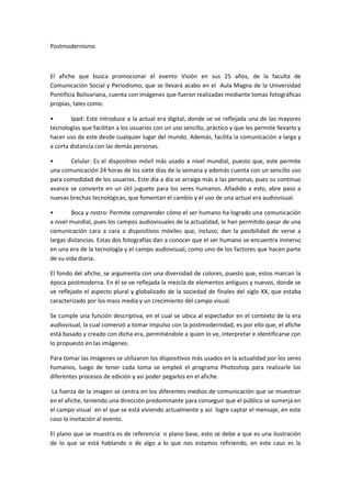 Este documento resume un afiche promocionando el evento "Visión en sus 25 años" de la Facultad de Comunicación Social y Periodismo de la Universidad Pontificia Bolivariana. El afiche incluye imágenes de un iPad, celular y rostro tomadas con una cámara para representar la era digital actual. El fondo colorido representa la época postmoderna caracterizada por la mezcla de lo antiguo y nuevo. El afiche busca ubicar al espectador en el contexto audiovisual postmoderno a través de las imágenes de dispositivos usados diariamente