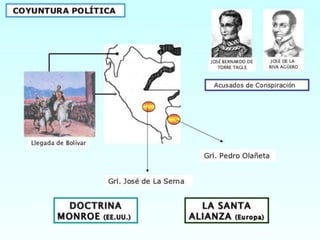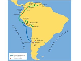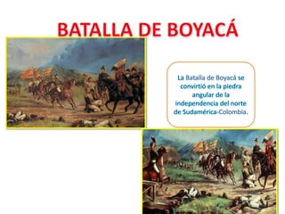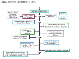 El documento describe varias batallas importantes en la independencia de países sudamericanos como Venezuela, Ecuador y Perú. La batalla de Carabobo selló la independencia de Venezuela, mientras que la batalla de Pichincha marcó la independencia política del Ecuador. Bolívar ayudó a liberar al Ecuador y luego llegó al Perú, donde dirigió victorias en las batallas de Junín y Ayacucho que finalmente le dieron la independencia al Perú.