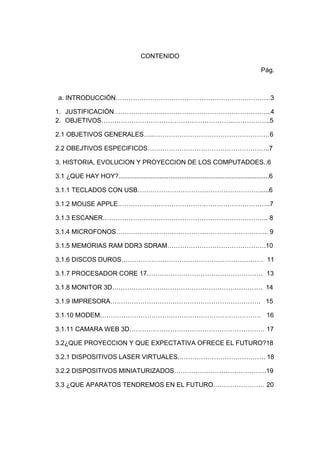 Este documento resume la historia, evolución y proyección de los computadores. Detalla los componentes y tecnologías actuales como teclados USB, mouse, escáneres, memorias RAM DDR3 y discos duros. También describe las proyecciones futuras como dispositivos láser virtuales y miniaturizados. Finalmente, explica algunos aparatos futuros como teclados láser virtuales, ratones anillo y procesadores híbridos láser.