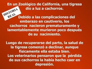 Una tigresa en un zoológico de California dio a luz prematuramente a cachorros que murieron poco después. La salud de la tigresa comenzó a declinar debido a la depresión por la pérdida de sus cachorros. Los veterinarios decidieron sustituir los cachorros fallecidos por cerdos recién nacidos envueltos en "piel de tigre" para engañar a la tigresa, y funcionó, ya que la tigresa cuidó de los cerdos como si fueran sus propios cach