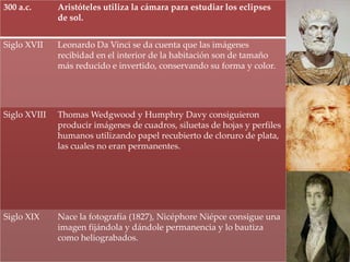 Este documento resume la historia de la fotografía desde sus orígenes en el siglo 18 hasta su desarrollo como arte en el siglo 20. Comienza explicando cómo Aristóteles utilizó una cámara oscura para estudiar eclipses solares y cómo Da Vinci se dio cuenta de cómo se forman las imágenes en el interior de una cámara. Luego describe los primeros intentos de fijar imágenes en el siglo 18 y el nacimiento de la fotografía en 1827. Finalmente, resume cómo la fotografía se ha desarroll