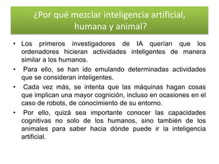 Este documento discute la inteligencia artificial, humana y animal. Explica que los primeros investigadores de IA querían que las máquinas hicieran tareas inteligentes de forma similar a los humanos. También analiza definiciones de IA y los esfuerzos de DeepMind para crear programas que superen a los humanos en juegos como Go.