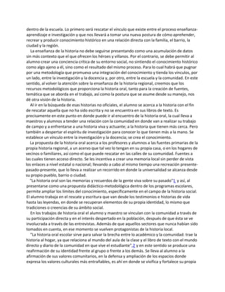 La autora propone el uso de la historia oral como un recurso metodológico para la enseñanza de la historia regional. Actualmente, la enseñanza de la historia se basa en métodos tradicionales como la memorización y la exposición dirigida por el maestro. La historia oral involucra a los estudiantes directamente con miembros de la comunidad para recopilar testimonios vivientes sobre el pasado local. Esto establece un vínculo entre la investigación, la docencia y la comunidad. Además, permite que los estud