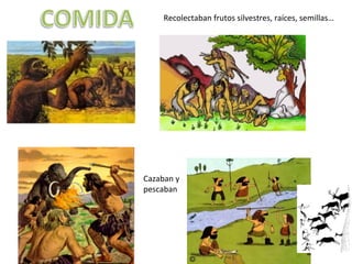 Los primeros humanos existieron hace unos tres millones de años y se dedicaban a la recolección de frutos, raíces y semillas silvestres así como a la caza y la pesca en grupo, creando técnicas como trampas para grandes animales. Vivían de forma nómada, moviéndose en busca de comida según las estaciones, y con el tiempo desarrollaron el lenguaje hablado, el dominio del fuego, y la elaboración de cerámica y prendas de vestir.