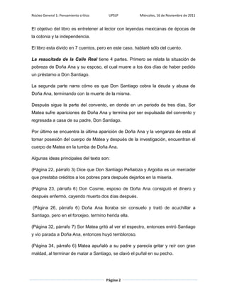Este documento presenta un resumen de un cuento del libro "Historias siniestras de conventos y monasterios". El cuento se titula "La resucitada de la Calle Real" y trata sobre una mujer pobre llamada Doña Ana que es abusada y asesinada por Don Santiago después de que su esposo muere endeudado. Más tarde, el espíritu de Doña Ana se le aparece a la hija de Don Santiago, Sor Matea, quien es llevada a la casa de su padre. Allí, el espíritu toma