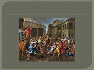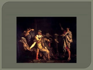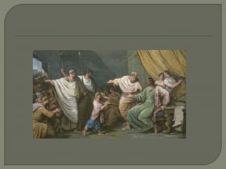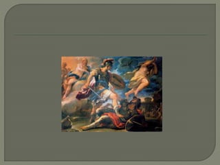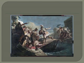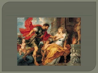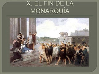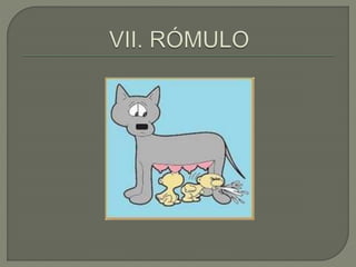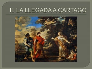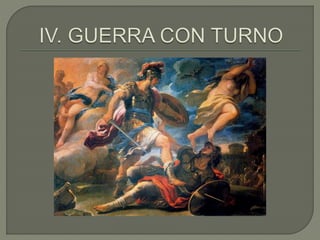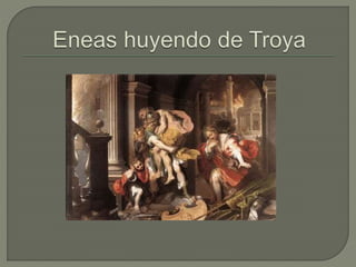 El documento narra la historia de Eneas tras la guerra de Troya, quien busca una nueva patria y pasa por diversas aventuras, incluyendo su encuentro con Dido en Cartago y su descenso al inframundo. El relato continúa con la fundación de Roma, desde la historia de Rómulo y Remo hasta la transformación de la República Romana tras la caída de Tarquinio. A través de múltiples reyes, se enfatizan eventos clave como el establecimiento de leyes, la expansión territorial y la resistencia contra los reyes etruscos.