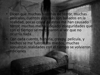 Este documento presenta varias historias de terror populares como creepypastas, películas como Actividad Paranormal y Freddy Krueger, y otros cuentos aterradores. El autor disfruta de traumar a la gente con estas historias de terror relacionadas con redes sociales y la vida cotidiana para divertirse a costa de los demás.
