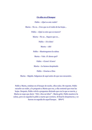 Pablo y Marta estaban en el bosque cuando escucharon ruidos extraños. Pablo pensó que era un lobo y le pidió a Marta que corriera. Lograron escapar del bosque.