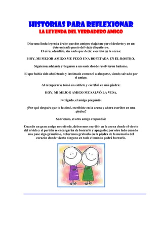 La leyenda cuenta la historia de dos amigos que discuten durante un viaje por el desierto. Uno ofende al otro, quien escribe en la arena "Hoy mi mejor amigo me pegó una bofetada". Más tarde, cuando uno se ahoga en un oasis, el otro lo salva y escribe en una piedra "Hoy mi mejor amigo me salvó la vida". Al preguntarle por qué, responde que los actos malos se escriben en la arena para que se borren, mientras los buenos se graban en piedra para recordarlos siempre.