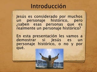 El documento discute si Jesús cumple los requisitos para ser considerado un personaje histórico. Explica que un personaje histórico debe ser real, tener pruebas arqueológicas o testigos, haber dejado huella en la historia y haber cambiado el mundo. Luego argumenta que Jesús cumple estos requisitos porque existen pruebas escritas y orales de su existencia, como la Biblia y testigos, y que a pesar del tiempo transcurrido sigue siendo recordado y admirado, por lo que concluye que Jesús