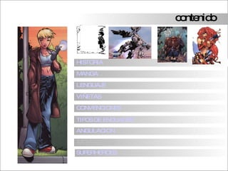 El documento resume la historia de los superhéroes y cómics. Comienza describiendo el origen europeo del cómic a finales del siglo XIX y su desarrollo en Estados Unidos a principios del siglo XX. Luego describe las convenciones y técnicas utilizadas en los cómics como viñetas, globos, onomatopeyas y ángulos de cámara. Finalmente, resume el desarrollo de los cómics en diferentes países y géneros como el manga japonés.