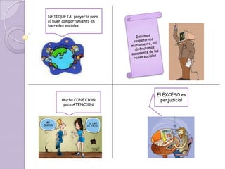 Este documento presenta lineamientos sobre el buen uso y comportamiento en las redes sociales, conocido como netiqueta. En menos de 3 oraciones, resume que se debe mostrar respeto a la privacidad de otros al no publicar información o fotos sin permiso, no agregar amigos desconocidos que podrían dañar la información personal, y usar las redes de forma responsable mostrando la misma conducta que en la vida real.