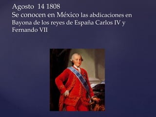 1) En septiembre de 1810, Miguel Hidalgo y Costilla lideró un levantamiento armado en Dolores para luchar por la independencia de México de España. 2) En octubre, José María Morelos se unió a la lucha insurgente y obtuvo varias victorias iniciales. 3) Sin embargo, en enero de 1811 las fuerzas realistas derrotaron a los insurgentes en la batalla de Puente de Calderón, lo que marcó un punto de inflexión en la guerra por la independencia.
