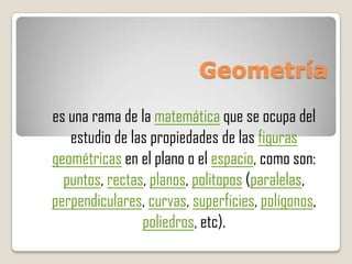 Este documento proporciona definiciones y descripciones de varios conceptos básicos de geometría, incluyendo figuras geométricas (puntos, rectas, planos, polígonos), curvas (elipses, parábolas, hipérbolas), cuerpos geométricos tridimensionales (esferas, cilindros, conos) y sus propiedades. Explica que la geometría estudia estas formas y sus características como la forma, tamaño y posición relativa.