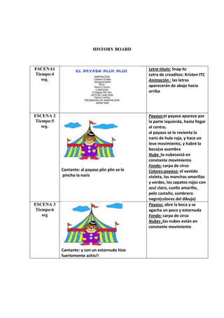El documento presenta un resumen de 5 escenas de un video musical. Cada escena describe los elementos visuales como un payaso, nubes y fondo de una carpa de circo, así como la letra de la canción que habla de un payaso cuya nariz explota y estornuda fuertemente.