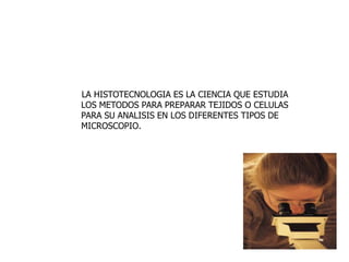 La histotecnología estudia los métodos para preparar tejidos y células para su análisis microscópico. Involucra procesos como la fijación, deshidratación, corte e inmersión de tejidos, así como técnicas de coloración, para preservar la morfología celular y permitir diagnósticos médicos. Se ha desarrollado a la par de avances en microscopía, incluyendo los microscopios óptico, de fluorescencia, electrónico y otros.
