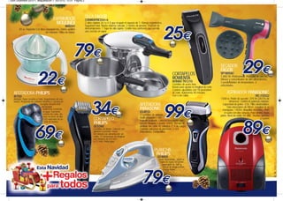Este documento presenta una variedad de electrodomésticos y pequeños aparatos eléctricos, incluyendo exprimidores, cafeteras, afeitadoras, secadores de pelo, aspiradores, batidoras y más. Proporciona detalles sobre las características y especificaciones de cada producto.