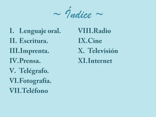 Este documento resume los principales hitos en la historia de la comunicación, incluyendo el lenguaje oral, la escritura, la imprenta, la prensa, el telégrafo, la fotografía, el teléfono, la radio, el cine, la televisión e Internet. Explica brevemente el origen y desarrollo de cada tecnología y cómo una condujo a la siguiente.