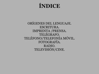 Este documento resume los principales hitos en la historia de la comunicación humana, incluyendo el origen del lenguaje, la escritura, la imprenta, el telégrafo, el teléfono, la fotografía, la radio, la televisión y el cine. Explica brevemente los orígenes e inventores clave de cada tecnología de comunicación.