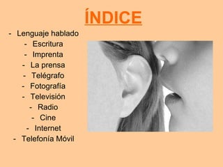El documento resume los principales hitos en la historia de la comunicación, incluyendo el lenguaje hablado, la escritura, la imprenta, la prensa, el telégrafo, la fotografía, la televisión, la radio, el cine e Internet. Describe brevemente el origen y desarrollo de cada uno de estos medios de comunicación.