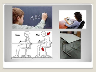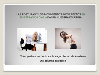 La higiene postural es importante para mantener una columna saludable y prevenir lesiones. Se debe evitar permanecer en posturas mantenidas o forzadas por más de 2 horas, organizar el espacio de trabajo, mantener la musculatura equilibrada, evitar giros bruscos del tronco y realizar pausas frecuentes. Algunas recomendaciones incluyen mantener una postura correcta al sentarse, pararse, levantarse y realizar tareas diarias.