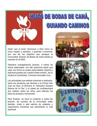 La Comunidad Jóvenes de Bodas de Caná busca que los jóvenes reconozcan a Dios como su creador y aprendan a amarse unos a otros a través de retiros espirituales. Realizarán donativos a una clínica, una romería religiosa y un paseo para fortalecer la amistad. Se invita a otros jóvenes a unirse a la comunidad para alimentar su vida espiritual.