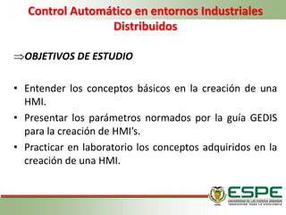 El documento presenta los conceptos básicos sobre las interfaces humano-máquina (HMI) y la Guía GEDIS para el diseño de HMI. Explica que la Guía GEDIS contiene 10 indicadores para el diseño de HMI, incluyendo la arquitectura, distribución de pantallas, navegación, uso del color, fuentes e información textual, estado de equipos, información y valores de proceso. Cada indicador provee directrices para organizar y presentar la información de manera efectiva y eficiente para el operador.