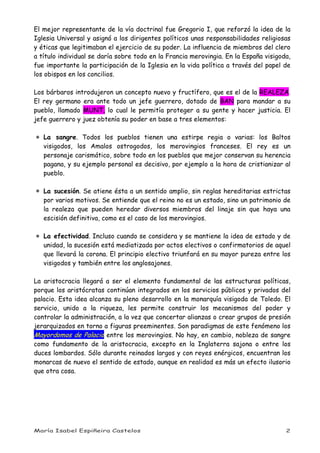 El documento describe la evolución política de los reinos germánicos después de la caída del Imperio Romano, incluyendo la introducción del concepto de realeza, el aumento del poder de la aristocracia, y el papel de la Iglesia en la vida política. También resume la formación del reino franco bajo Clodoveo I y sus hijos, la expansión territorial bajo Clotario I, y el declive del poder real con la figura del mayordomo de palacio ganando influencia.
