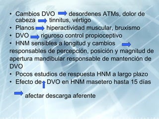 El documento analiza cómo los cambios en la dimensión vertical oclusal (DVO) afectan la sensibilidad y la respuesta de las fibras nerviosas en el músculo masetero, sugiriendo adaptaciones funcionales a largo plazo. A través de experimentos en ratas, se observó que la reducción de la sensibilidad de las aferencias nerviosas ocurre de forma gradual, con implicaciones para tratamientos ortodónticos y protésicos. Se concluye que los músculos masticatorios pueden adaptarse a cambios en DVO, lo que puede influir en la eficacia de la rehabilitación oclusal.
