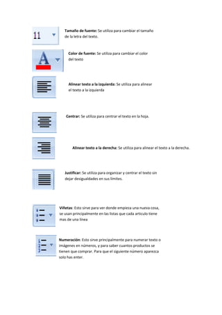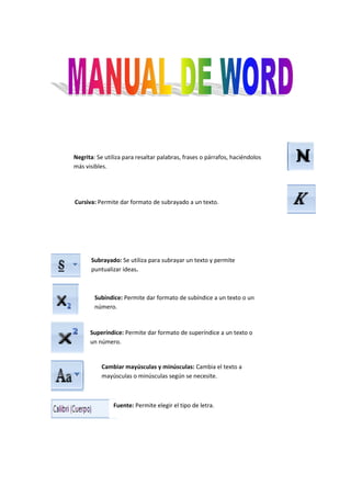 Este documento describe diferentes formatos de texto como negrita, cursiva y subrayado, así como opciones de fuente como tamaño, color y alineación. También explica elementos como subíndices, superíndices, mayúsculas, minúsculas, viñetas y numeración que permiten organizar y resaltar información en un texto.