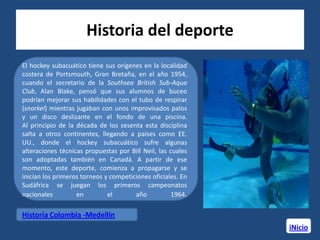 Este documento resume la historia, reglas y práctica del hockey subacuático. Comenzó en Gran Bretaña en 1954 y ahora se practica en varios países. En Colombia se practica desde hace 30 años, principalmente en Medellín. Las reglas dividen el juego en dos tiempos de 15 minutos cada uno. Los equipos usan aletas, gafas, palos y una pastilla para empujarla hacia la portería contraria.