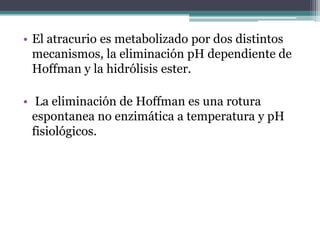 La eliminación de Hoffman es una reacción química espontánea no enzimática que ocurre a temperatura y pH fisiológicos, conduciendo a la formación de un alqueno menos sustituido a través de la eliminación beta de una amina cuaternaria. Esta reacción es el mecanismo por el cual el fármaco atracurio se metaboliza y degrada en el cuerpo.