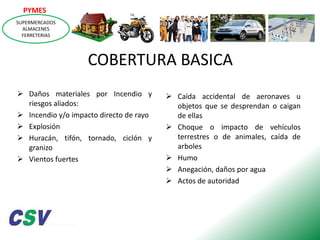 Este documento describe las coberturas básicas y asistencia al hogar de una póliza de hogar. La cobertura básica incluye daños materiales por incendio, explosión, huracanes, granizo, vientos fuertes, caída de aeronaves u objetos, choque de vehículos, rotura de vidrios y tuberías, gastos de extinción de incendios y remoción de escombros. La asistencia al hogar proporciona servicios de cerrajería, plomería, vidriería de emerg