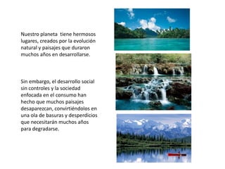 El documento describe los efectos negativos del desarrollo sin control y la sociedad enfocada en el consumo en el deterioro del medio ambiente. Señala que muchos paisajes naturales han desaparecido y se han convertido en basura que tardará años en degradarse. También promueve el uso de productos ecológicos de limpieza de la marca Amway que son biodegradables, no contaminantes y permiten ahorrar dinero.