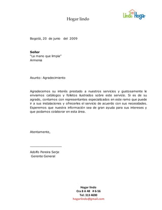 El documento es una carta de agradecimiento de una empresa llamada "Hogar lindo" a otra empresa llamada "La mano que limpia" por su interés en los servicios de limpieza. Hogar lindo ofrece enviar catálogos y folletos ilustrados sobre sus servicios de limpieza y enviar representantes para ofrecer un servicio personalizado de acuerdo a las necesidades de la empresa.