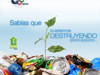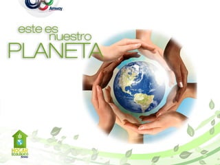 El documento trata sobre los problemas medioambientales que enfrenta el planeta como consecuencia de la contaminación y el desperdicio de recursos. Menciona que cada año se pierden 24,000 toneladas de suelo fértil, la contaminación del agua es una causa importante de muerte infantil, y un glaciar en Perú desapareció debido al calentamiento global. También resalta la importancia del reciclaje y el uso de productos biodegradables para reducir la contaminación y proteger el medio ambiente.