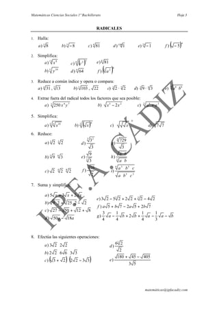 El documento presenta una serie de ejercicios de álgebra que involucran operaciones con radicales, racionalización de fracciones y simplificación de expresiones. Los ejercicios van desde hallar valores numéricos hasta sumar, restar, multiplicar y dividir expresiones radicales y fraccionarias. Al final se proporcionan las soluciones de cada ejercicio.