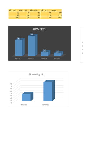 Este gráfico muestra el número de mujeres y hombres en diferentes años, con un total de 405 personas entre 2012 y 2015. El número de mujeres varió entre 60 y 80 cada año mientras que el número de hombres fluctuó entre 15 y 100, con un aumento general en el número total de personas durante ese período.