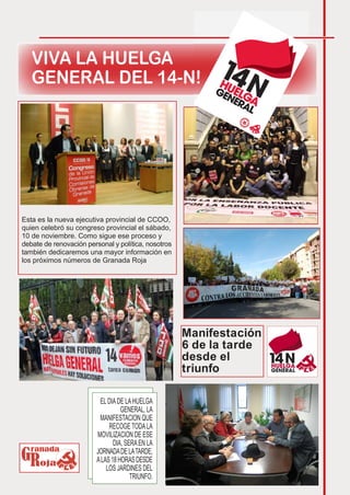 El documento resume las actividades de un encuentro de agrupaciones del PCA en Albolote, incluyendo una concentración de apoyo a Juan Manuel Sánchez Gordillo, una rueda de prensa sobre la huelga general del 14 de noviembre, y una visita al secretario general de CCOO de Granada. También describe los llamamientos a participar en la huelga general y en una cumbre alternativa en Cádiz los días 16 y 17 de noviembre en apoyo de los pueblos de América Latina.