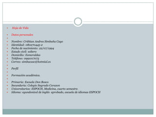 Este documento es la hoja de vida de Crithian Andres Simbaña Cayo, que incluye sus datos personales como nombre, identidad, fecha de nacimiento, estado civil y contacto. También resume su formación académica, incluyendo la primaria y secundaria completadas y estudios universitarios actuales de medicina en la ESPOCH, donde también aprobó el segundo nivel de inglés.