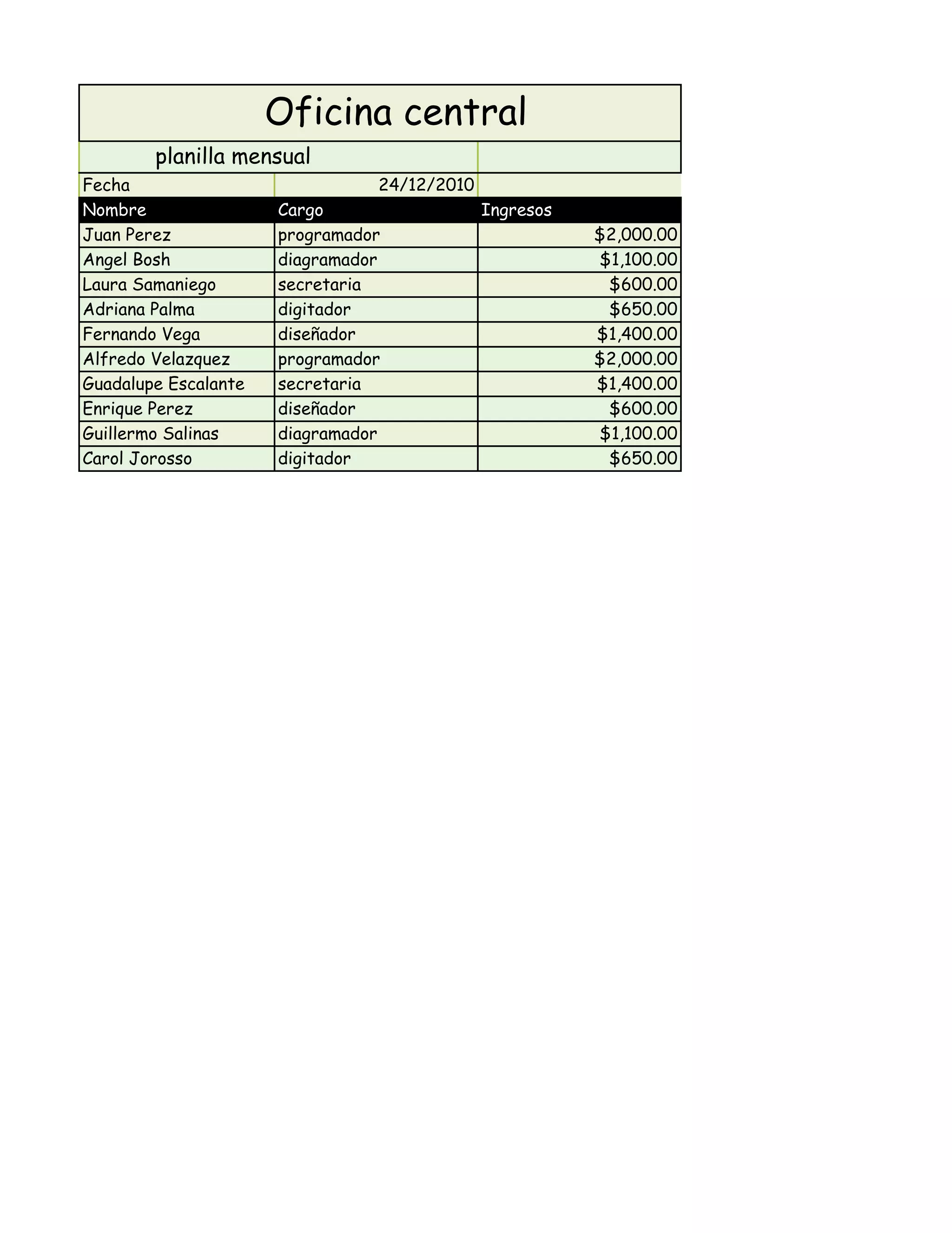 La planilla mensual de una oficina central del 24 de diciembre de 2010 lista los nombres, cargos e ingresos de 10 empleados. Los programadores ganan $2,000, los secretarios y digitadores ganan menos que los diagramadores y diseñadores, y los diagramadores ganan $1,100.