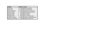 El documento presenta los nombres, ingresos y cargos de nueve empleados. Juan Pérez gana $1,200 como Director General, mientras que Alfredo Velásquez gana la mayor cantidad como jefe de Finanzas y Administración. Los demás empleados se desempeñan en puestos de edición, diseño, ventas y corrección.